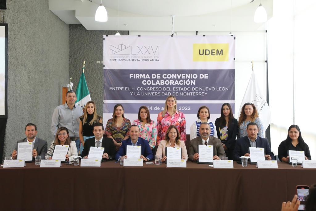 El Congreso del Estado de Nuevo León y la Universidad de Monterrey firmaron un convenio de colaboración para fomentar el Parlamento Abierto a través de capacitación, intercambio de experiencias, preparación académica y que estudiantes de la Escuela de Derecho y Ciencias Sociales de la UDEM puedan realizar su servicio y prácticas profesionales en el Poder Legislativo.
